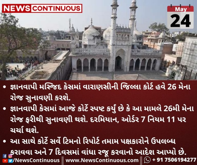 જ્ઞાનવાપી કેસમાં આજે કોર્ટે સ્પષ્ટ કર્યું છે કે આ મામલે 26મી મેના રોજ ફરીથી સુનાવણી થશે. દરમિયાન, ઓર્ડર 7 નિયમ 11 પર ચર્ચા થશે.