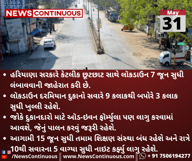 હરિયાણા સરકારે કેટલીક છૂટછાટ સાથે લૉકડાઉન 7 જૂન સુધી લંબાવવાની જાહેરાત કરી છે.