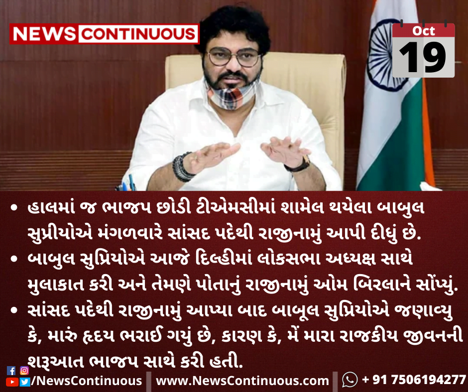 હાલમાં જ ભાજપ છોડી ટીએમસીમાં શામેલ થયેલા બાબુલ સુપ્રીયોએ મંગળવારે સાંસદ પદેથી રાજીનામું આપી દીધું છે.