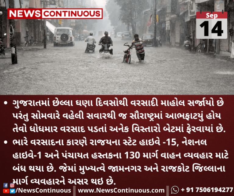 ભારે વરસાદના કારણે રાજયના સ્ટેટ હાઇવે -15, નેશનલ હાઇવે-1 અને પંચાયત હસ્તકના 130 માર્ગ વાહન વ્યવહાર માટે બંધ થયા છે. જેમાં મુખ્યત્વે જામનગર અને રાજકોટ જિલ્લાના માર્ગ વ્યવહારને અસર થઇ છે.