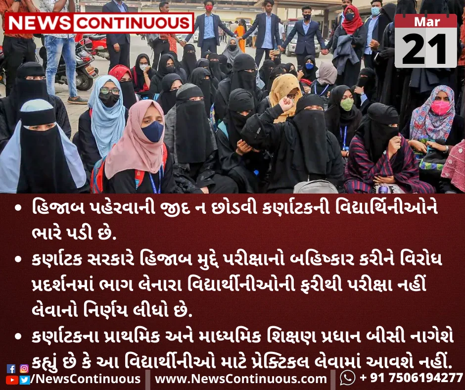 કર્ણાટક સરકારે હિજાબ મુદ્દે પરીક્ષાનો બહિષ્કાર કરીને વિરોધ પ્રદર્શનમાં ભાગ લેનારા વિદ્યાર્થીનીઓની ફરીથી પરીક્ષા નહીં લેવાનો નિર્ણય લીધો છે.