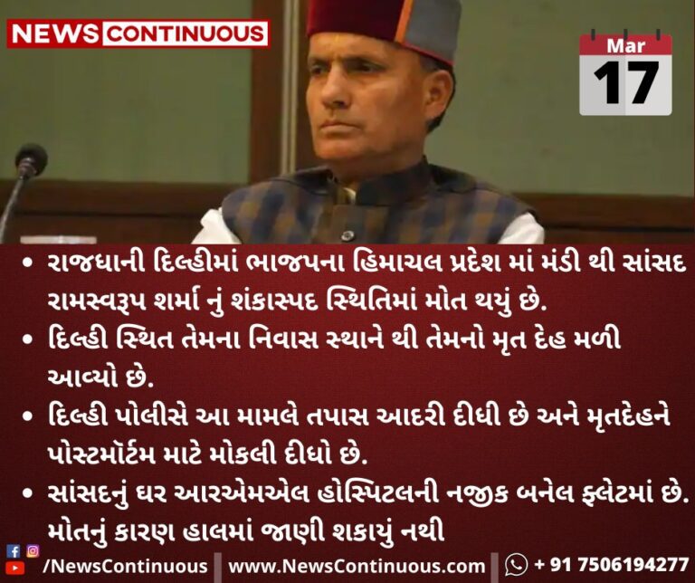 રાજધાની દિલ્હીમાં ભાજપના હિમાચલ પ્રદેશ માં મંડી થી સાંસદ રામસ્વરૂપ શર્મા નું શંકાસ્પદ સ્થિતિમાં મોત થયું છે.