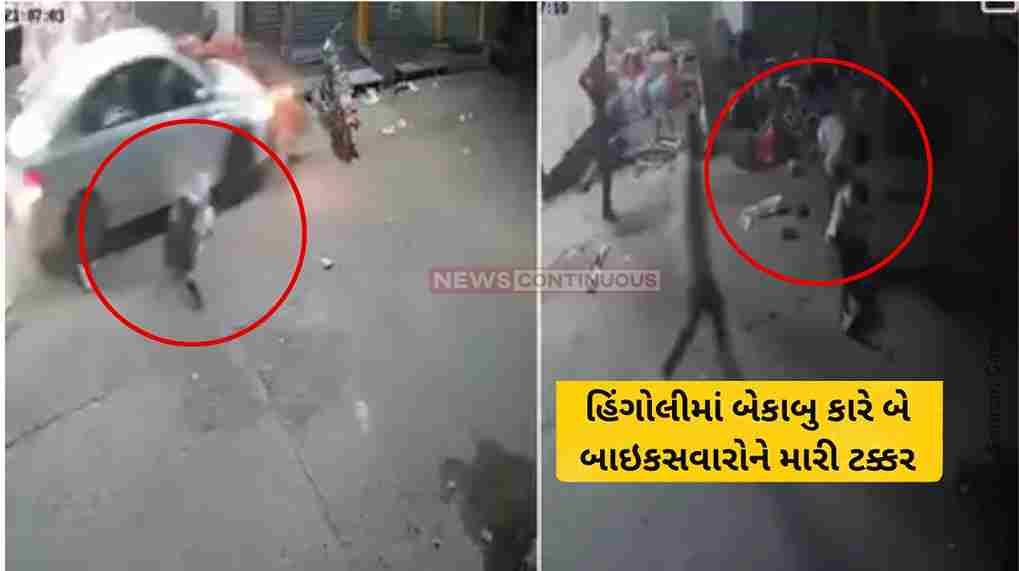 Hingoli Car Accident: મહારાષ્ટ્રના હિંગોલીમાં એક અનિયંત્રિત કારે બે બાઇક સવારો અને અન્ય એક વ્યક્તિને ટક્કર મારી હોવાની ઘટના પ્રકાશમાં આવી છે. આ અકસ્માતમાં એક વ્યક્તિને ઈજા થઈ છે. ઘટનાસ્થળે હાજર લોકોએ ઘાયલ વ્યક્તિને તાત્કાલિક હોસ્પિટલમાં દાખલ કર્યો. અકસ્માતના સીસીટીવી ફૂટેજ પણ સામે આવ્યા છે.