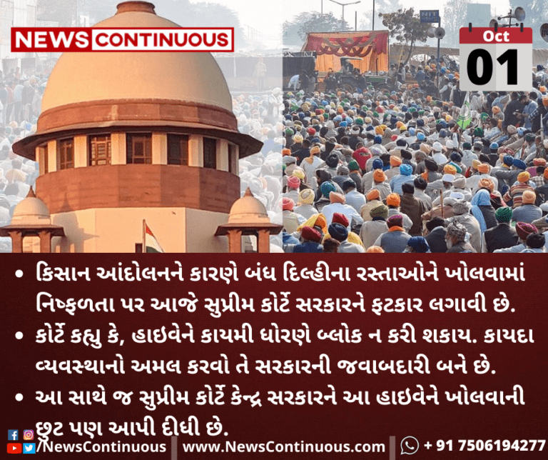 કિસાન આંદોલનને કારણે બંધ દિલ્હીના રસ્તાઓને ખોલવામાં નિષ્ફળતા પર આજે સુપ્રીમ કોર્ટે સરકારને ફટકાર લગાવી છે.
