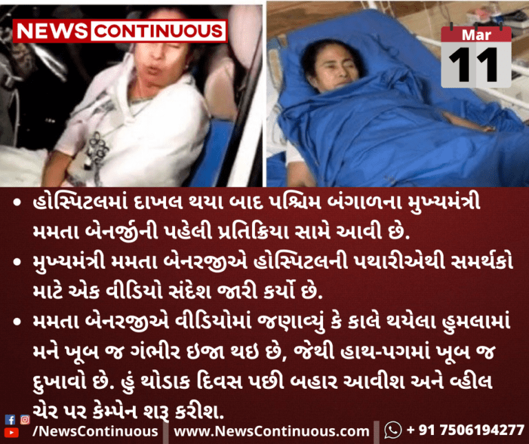 હોસ્પિટલમાં દાખલ થયા બાદ પશ્ચિમ બંગાળના મુખ્યમંત્રી મમતા બેનર્જીની પહેલી પ્રતિક્રિયા સામે આવી છે. મુખ્યમંત્રી મમતા બેનરજીએ હોસ્પિટલની પથારીએથી સમર્થકો માટે એક વીડિયો સંદેશ જારી કર્યો છે.