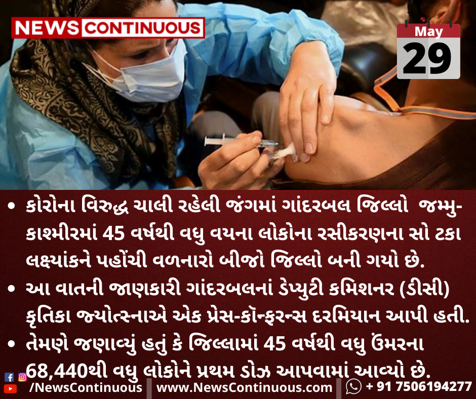 કોરોના વિરુદ્ધ ચાલી રહેલી જંગમાં ગાંદરબલ જિલ્લો જમ્મુ-કાશ્મીરમાં 45 વર્ષથી વધુ વયના લોકોના રસીકરણના સો ટકા લક્ષ્યાંકને પહોંચી વળનારો બીજો જિલ્લો બની ગયો છે.