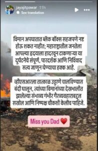 જય પવારે પોતાની પોસ્ટમાં બે મહત્વના મુદ્દાઓ પર ભાર મૂક્યો છે: ૧. VSR કંપની પર પ્રતિબંધ: અકસ્માત જે કંપનીના વિમાનમાં થયો હતો, તે VSR કંપનીના તમામ ઉડાણો પર તાત્કાલિક પ્રતિબંધ મૂકવો જોઈએ. ૨. નિષ્પક્ષ તપાસ: વિમાનની જાળવણી (Maintenance) માં થયેલી સંભવિત ગંભીર ગેરરીતિઓની ઊંડી અને નિષ્પક્ષ તપાસ થવી જોઈએ.તેમણે લખ્યું છે કે, “વિમાન અકસ્માતમાં બ્લેક બોક્સ આટલી સરળતાથી નષ્ટ થઈ શકતા નથી. મહારાષ્ટ્રની જનતાને આ હૃદયદ્રાવક દુર્ઘટનાનું સંપૂર્ણ અને નિર્વિવાદ સત્ય જાણવાનો અધિકાર છે.”