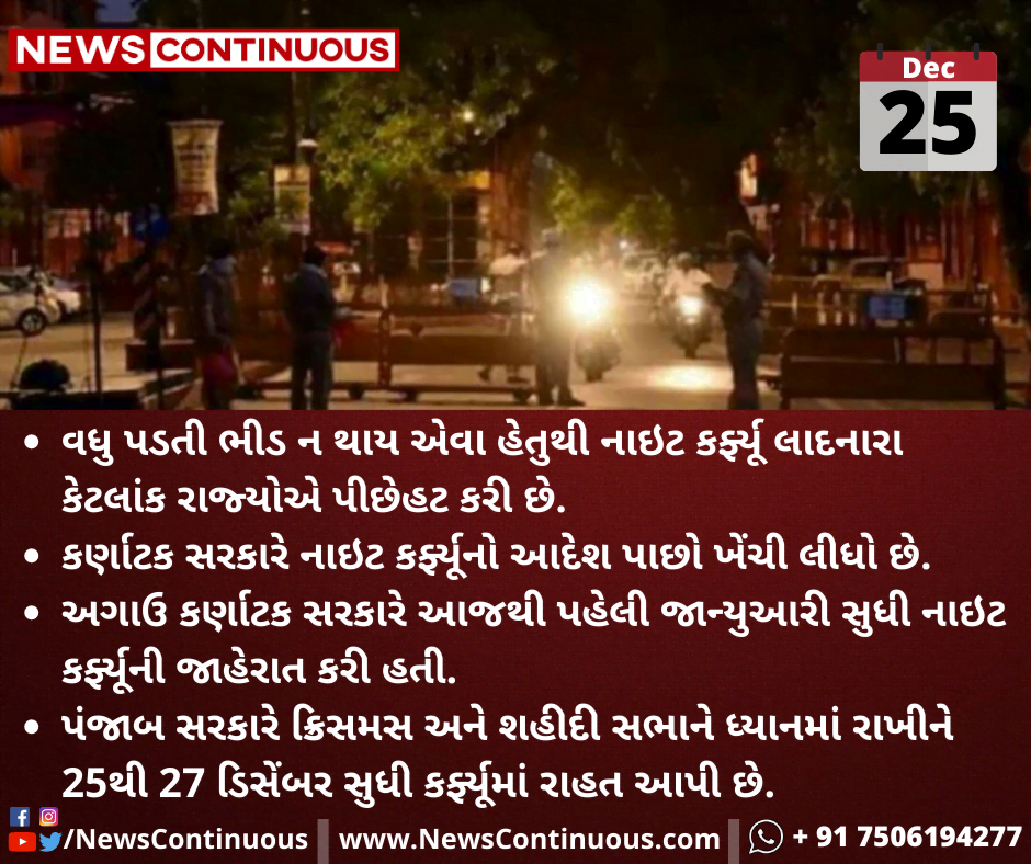 - વધુ પડતી ભીડ ન થાય એવા હેતુથી નાઇટ કર્ફ્યૂ લાદનારા કેટલાંક રાજ્યોએ પીછેહટ કરી છે.
