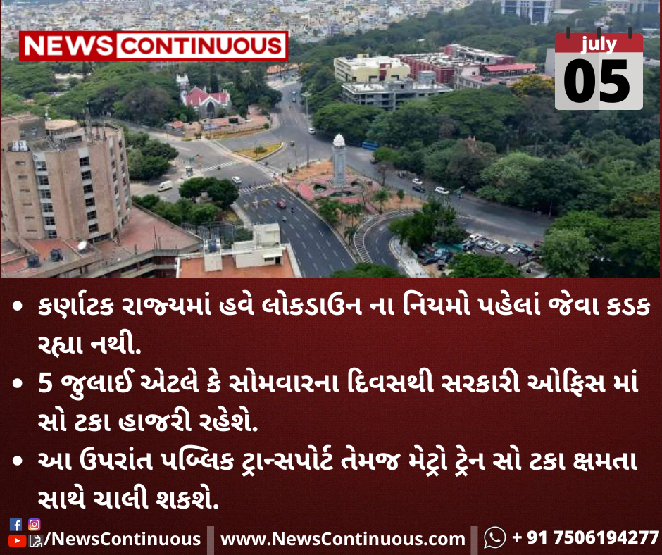કર્ણાટક રાજ્યમાં હવે લોકડાઉન ના નિયમો પહેલાં જેવા કડક રહ્યા નથી. 5 જુલાઈ એટલે કે સોમવારના દિવસથી સરકારી ઓફિસ માં સો ટકા હાજરી રહેશે.
