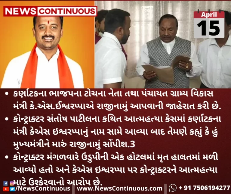 કર્ણાટક(Karnataka)ના ભાજપ(BJP)ના ટોચના નેતા તથા પંચાયત ગ્રામ્ય વિકાસ મંત્રી કે.એસ.ઈશ્વરપ્પા(ks eshwarappa)એ રાજીનામું આપવાની જાહેરાત કરી છે.