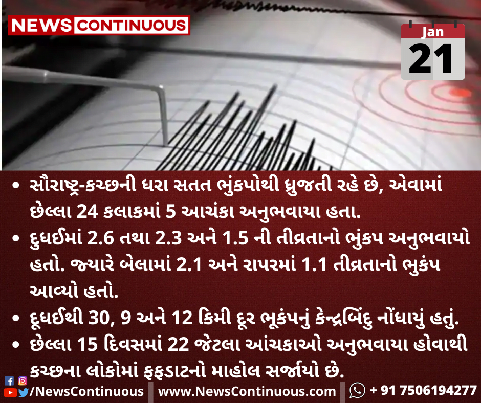 છેલ્લા 15 દિવસમાં 22 જેટલા આંચકાઓ અનુભવાયા હોવાથી કચ્છના લોકોમાં ફફડાટનો માહોલ સર્જાયો છે.