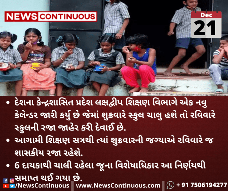 દેશના કેન્દ્રશાસિત પ્રદેશ લક્ષદ્વીપ શિક્ષણ વિભાગે એક નવુ કેલેન્ડર જારી કર્યુ છે જેમાં શુક્રવારે સ્કુલ ચાલુ હશે તો રવિવારે સ્કુલની રજા જાહેર કરી દેવાઈ છે.