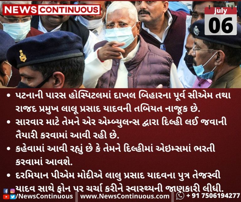 દરમિયાન પીએમ મોદીએ(PM Modi) લાલુ પ્રસાદ યાદવના પુત્ર તેજસ્વી યાદવ(Tejaswi Yadav) સાથે ફોન પર ચર્ચા કરીને સ્વાસ્થ્યની જાણકારી(Health information) લીધી.
