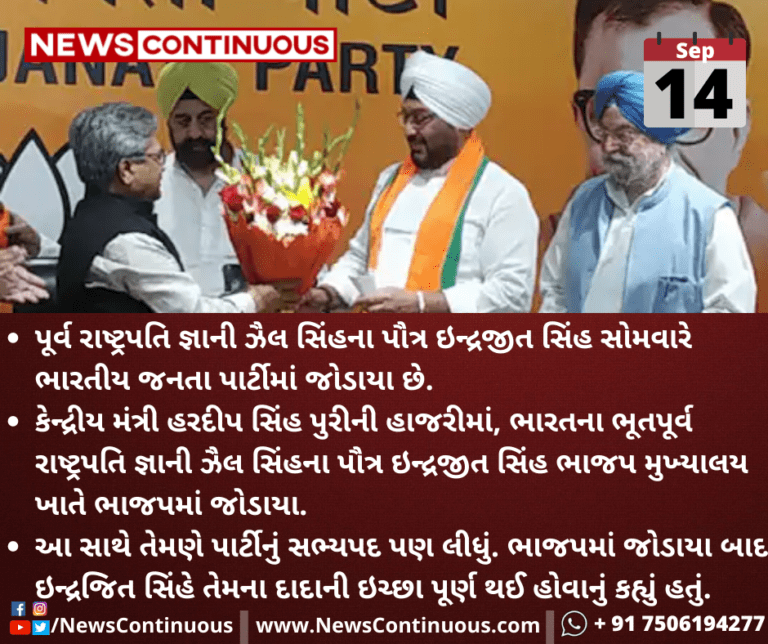 કેન્દ્રીય મંત્રી હરદીપ સિંહ પુરીની હાજરીમાં, ભારતના ભૂતપૂર્વ રાષ્ટ્રપતિ જ્ઞાની ઝૈલ સિંહના પૌત્ર ઇન્દ્રજીત સિંહ ભાજપ મુખ્યાલય ખાતે ભાજપમાં જોડાયા.