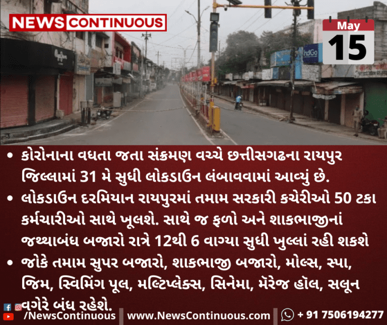 કોરોનાના વધતા જતા સંક્રમણ વચ્ચે છત્તીસગઢના રાયપુર જિલ્લામાં 31 મે સુધી લોકડાઉન લંબાવવામાં આવ્યું છે.