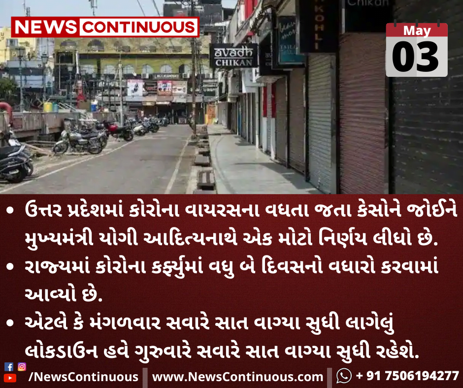 રાજ્યમાં કોરોના કર્ફ્યુમાં વધુ બે દિવસનો વધારો કરવામાં આવ્યો છે.