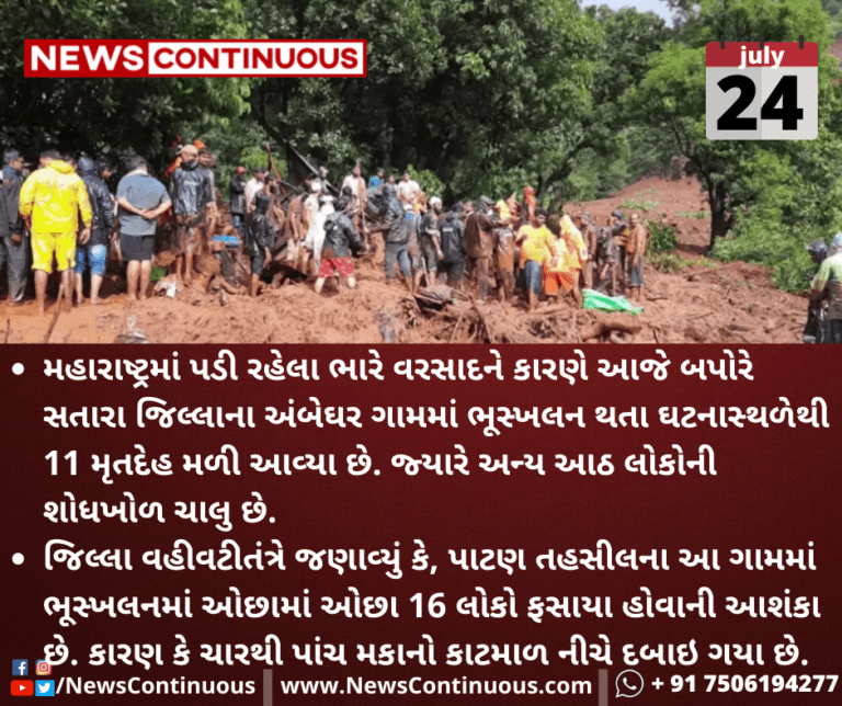 મહારાષ્ટ્રમાં પડી રહેલા ભારે વરસાદને કારણે આજે બપોરે સતારા જિલ્લાના અંબેઘર ગામમાં ભૂસ્ખલન થતા ઘટનાસ્થળેથી 11 મૃતદેહ મળી આવ્યા છે. જ્યારે અન્ય આઠ લોકોની શોધખોળ ચાલુ છે.