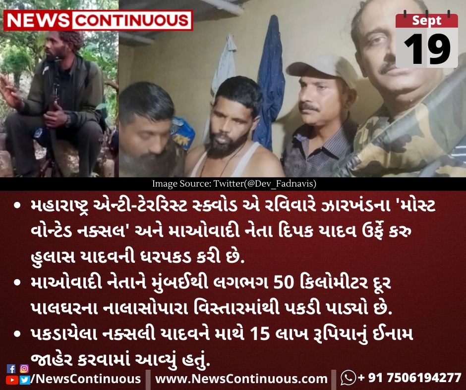 મહારાષ્ટ્ર એન્ટી-ટેરરિસ્ટ સ્ક્વોડ એ રવિવારે ઝારખંડના 'મોસ્ટ વોન્ટેડ નક્સલ' અને માઓવાદી નેતા દિપક યાદવ ઉર્ફે કરુ હુલાસ યાદવની ધરપકડ કરી છે.