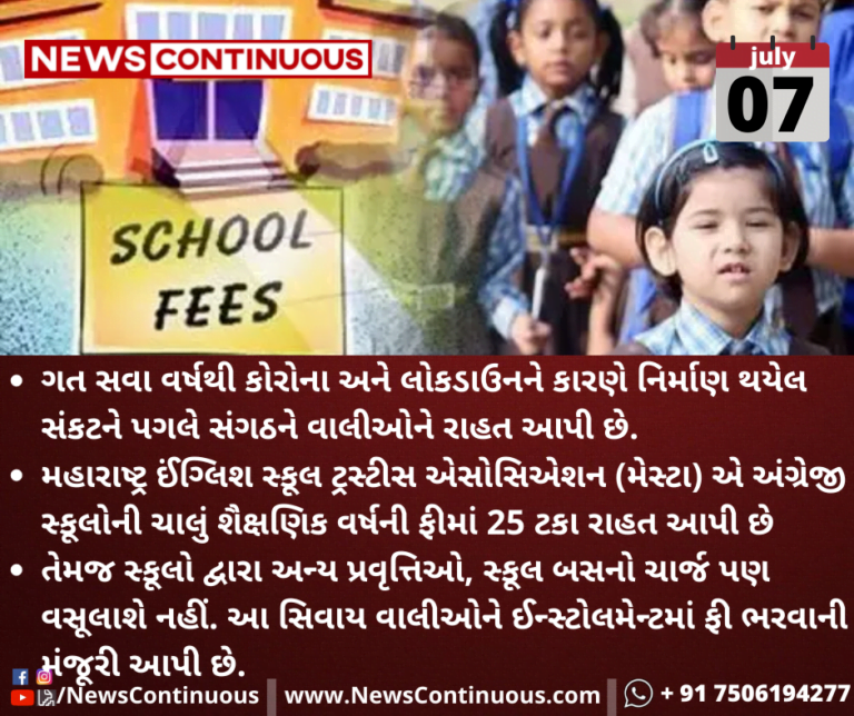 મહારાષ્ટ્ર ઈંગ્લિશ સ્કૂલ ટ્રસ્ટીસ એસોસિએશન (મેસ્ટા) એ અંગ્રેજી સ્કૂલોની ચાલું શૈક્ષણિક વર્ષની ફીમાં 25 ટકા રાહત આપી છે