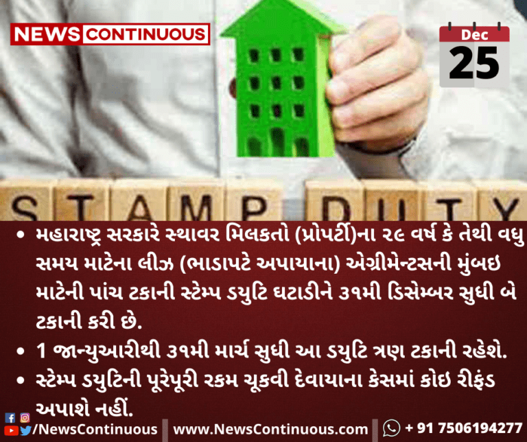 - મહારાષ્ટ્ર સરકારે સ્થાવર મિલકતો (પ્રોપર્ટી)ના ૨૯ વર્ષ કે તેથી વધુ સમય માટેના લીઝ (ભાડાપટે અપાયાના) એગ્રીમેન્ટસની મુંબઇ માટેની પાંચ ટકાની સ્ટેમ્પ ડયુટિ ઘટાડીને ૩૧મી ડિસેમ્બર સુધી બે ટકાની કરી છે.
