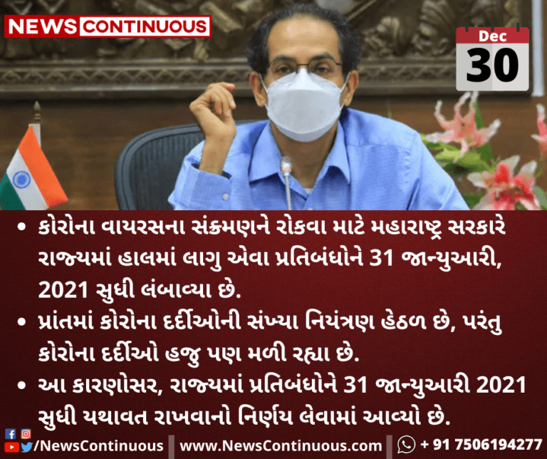 - કોરોના વાયરસના સંક્ર્મણને રોકવા માટે મહારાષ્ટ્ર સરકારે રાજ્યમાં હાલમાં લાગુ એવા પ્રતિબંધોને 31 જાન્યુઆરી, 2021 સુધી લંબાવ્યા છે.