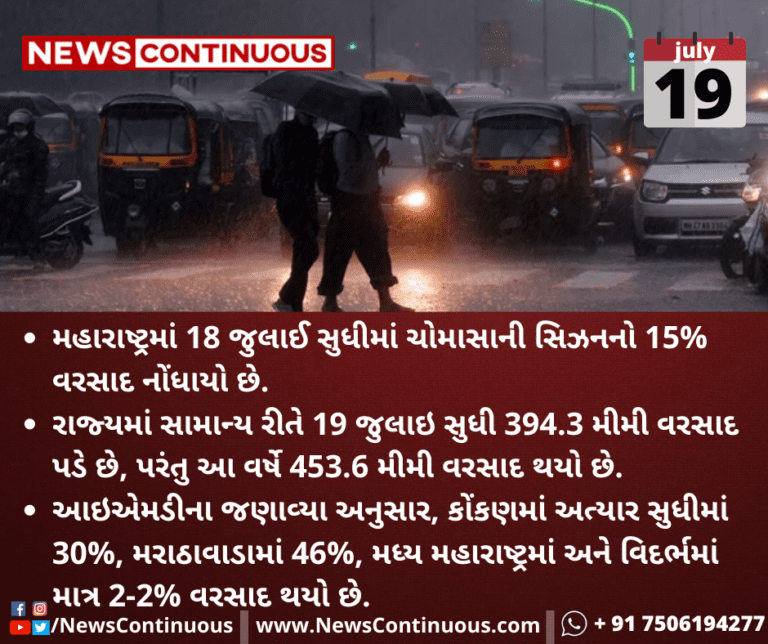મહારાષ્ટ્રમાં 18 જુલાઈ સુધીમાં ચોમાસાની સિઝનનો 15% વરસાદ નોંધાયો છે.