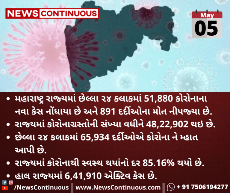 મહારાષ્ટ્ર રાજ્યમાં છેલ્લા ૨૪ કલાકમાં 51,880 કોરોનાના નવા કેસ નોંધાયા છે અને 891 દર્દીઓના મોત નીપજ્યા છે.