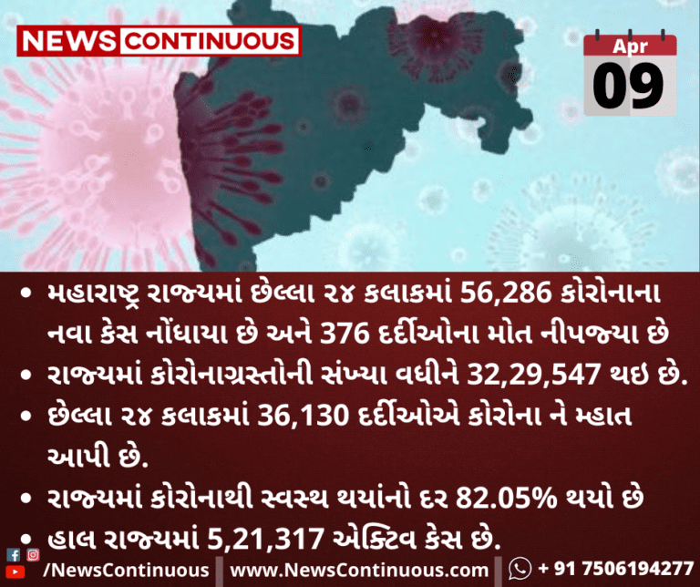 મહારાષ્ટ્ર રાજ્યમાં છેલ્લા ૨૪ કલાકમાં 56,286 કોરોનાના નવા કેસ નોંધાયા છે અને 376 દર્દીઓના મોત નીપજ્યા છે.