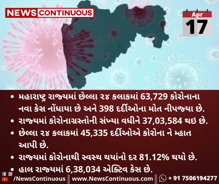 મહારાષ્ટ્ર રાજ્યમાં છેલ્લા ૨૪ કલાકમાં 63,729 કોરોનાના નવા કેસ નોંધાયા છે અને 398 દર્દીઓના મોત નીપજ્યા છે.
