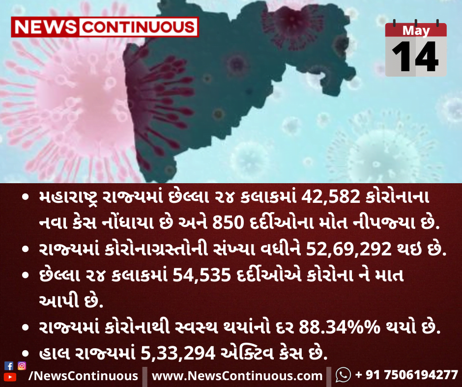 મહારાષ્ટ્ર રાજ્યમાં છેલ્લા ૨૪ કલાકમાં 42,582 કોરોનાના નવા કેસ નોંધાયા છે અને 850 દર્દીઓના મોત નીપજ્યા છે.