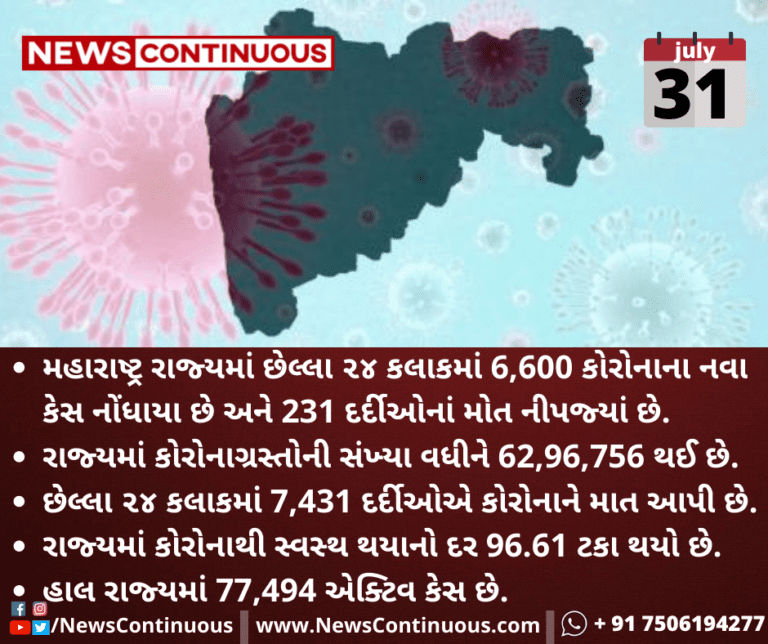 મહારાષ્ટ્ર રાજ્યમાં છેલ્લા ૨૪ કલાકમાં 6,600 કોરોનાના નવા કેસ નોંધાયા છે અને 231 દર્દીઓનાં મોત નીપજ્યાં છે.