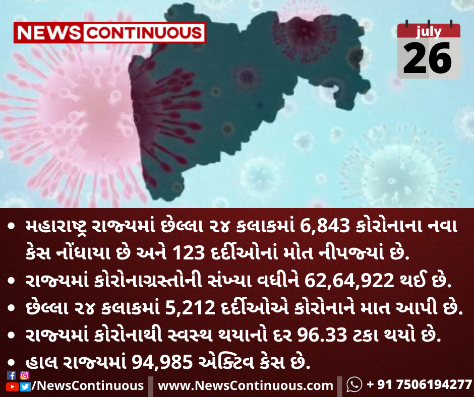મહારાષ્ટ્ર રાજ્યમાં છેલ્લા ૨૪ કલાકમાં 6,843 કોરોનાના નવા કેસ નોંધાયા છે અને 123 દર્દીઓનાં મોત નીપજ્યાં છે.