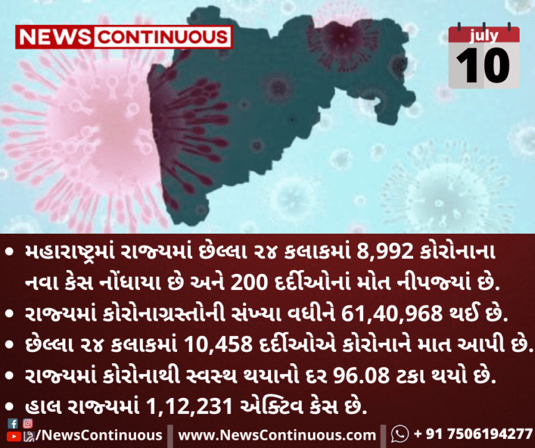 મહારાષ્ટ્રમાં રાજ્યમાં છેલ્લા ૨૪ કલાકમાં 8,992 કોરોનાના નવા કેસ નોંધાયા છે અને 200 દર્દીઓનાં મોત નીપજ્યાં છે.