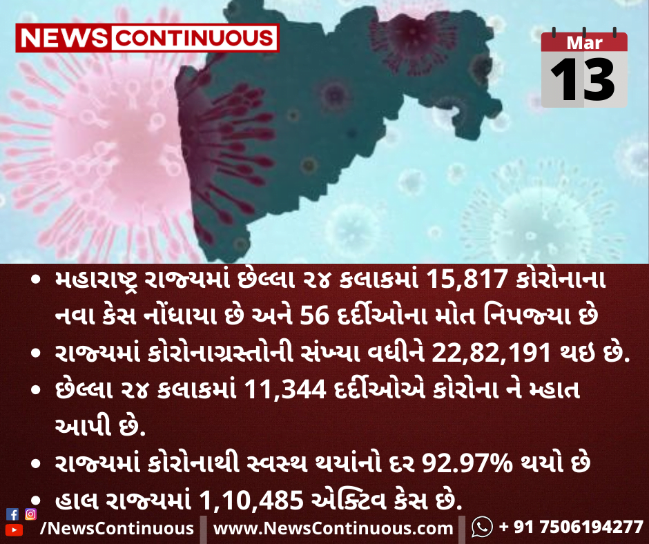 મહારાષ્ટ્ર રાજ્યમાં છેલ્લા ૨૪ કલાકમાં 15,817 કોરોનાના નવા કેસ નોંધાયા છે અને 56 દર્દીઓના મોત નિપજ્યા છે
