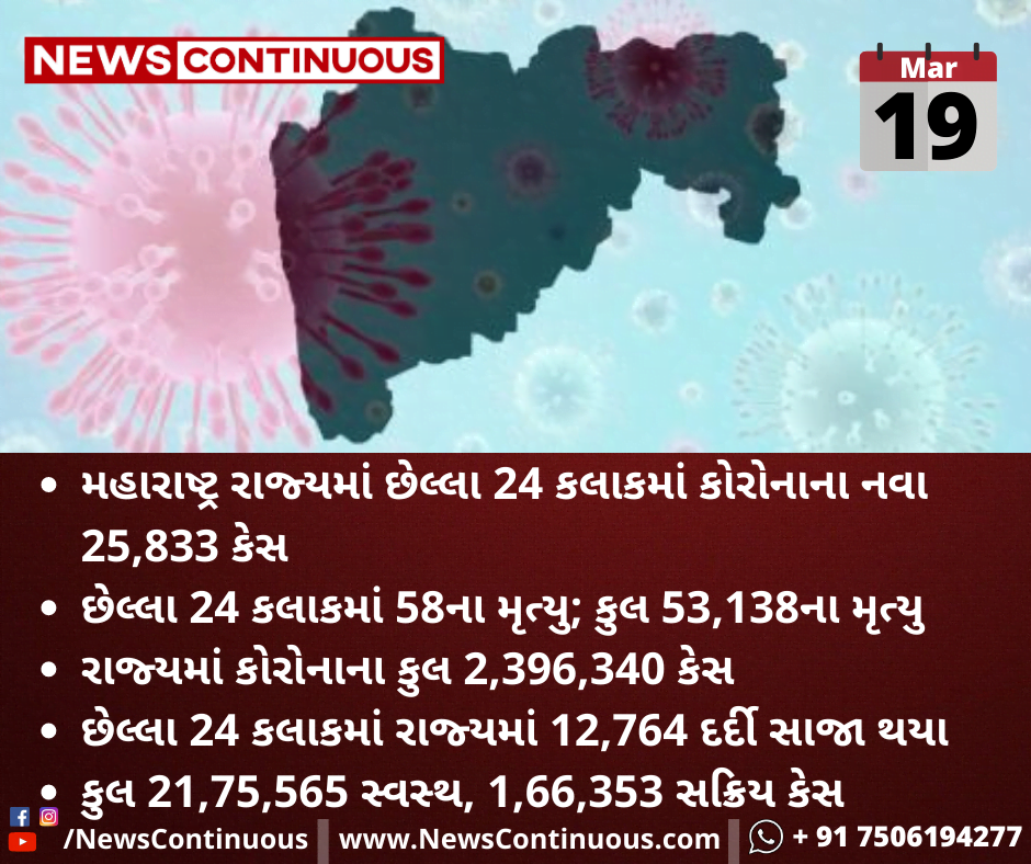 મહારાષ્ટ્ર રાજ્યમાં 24 કલાકમાં કોરોનાના નવા 25,833 કેસ
