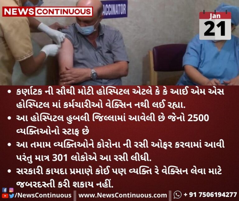 - કર્ણાટક ની સૌથી મોટી હોસ્પિટલ એટલે કે કે આઈ એમ એસ હોસ્પિટલ માં કર્મચારીઓ વેક્સિન નથી લઈ રહ્યા.
