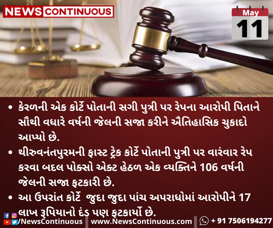 કેરળની(kerala) એક કોર્ટે(Court) પોતાની સગી પુત્રી પર રેપના(Rape) આરોપી પિતાને સૌથી વધારે વર્ષની જેલની(Jail) સજા કરીને ઐતિહાસિક ચુકાદો (Historic judgment)આપ્યો છે.