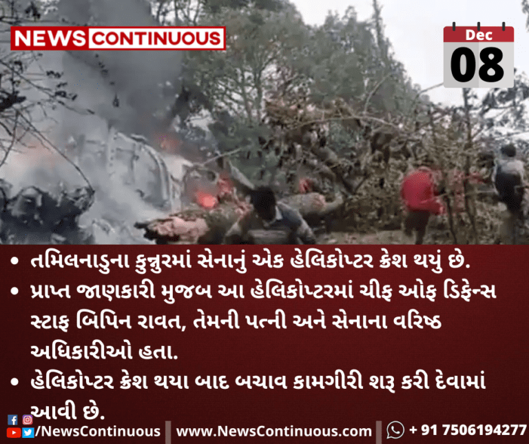 તમિલનાડુના કુન્નુરમાં સેનાનું એક હેલિકોપ્ટર ક્રેશ થયું છે.