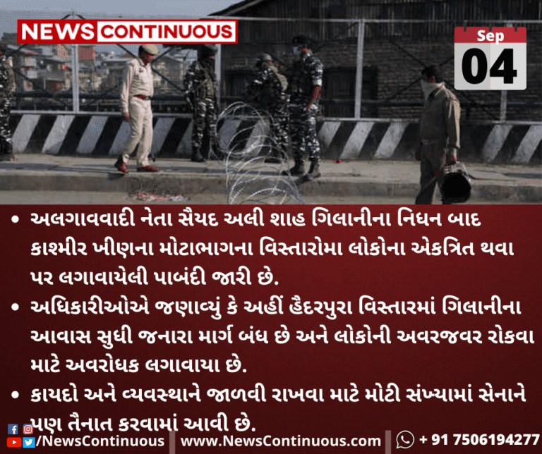 અલગાવવાદી નેતા સૈયદ અલી શાહ ગિલાનીના નિધન બાદ કાશ્મીર ખીણના મોટાભાગના વિસ્તારોમા લોકોના એકત્રિત થવા પર લગાવાયેલી પાબંદી જારી છે.