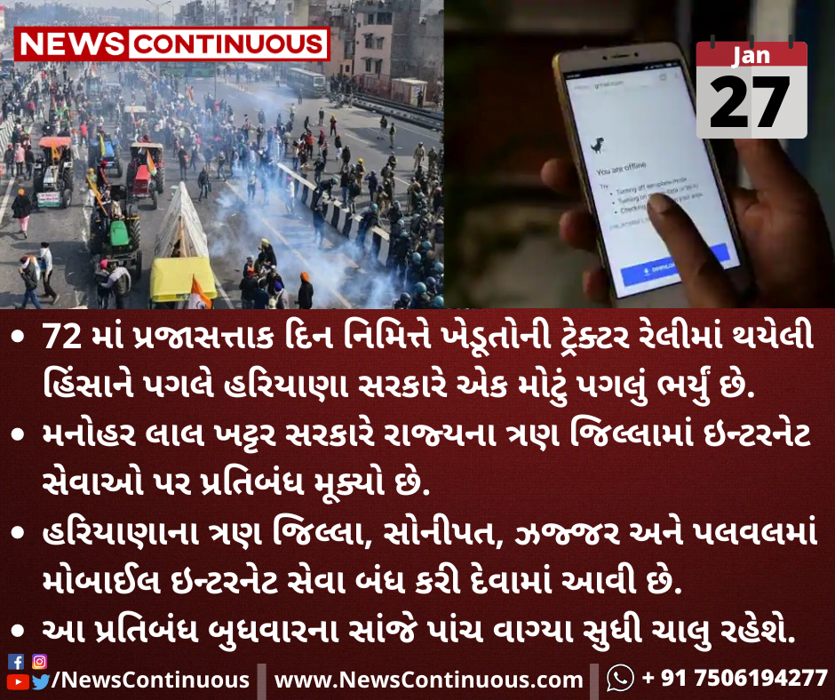 72 માં પ્રજાસત્તાક દિન નિમિત્તે ખેડૂતોની ટ્રેક્ટર રેલીમાં થયેલી હિંસાને પગલે હરિયાણા સરકારે એક મોટું પગલું ભર્યું છે.