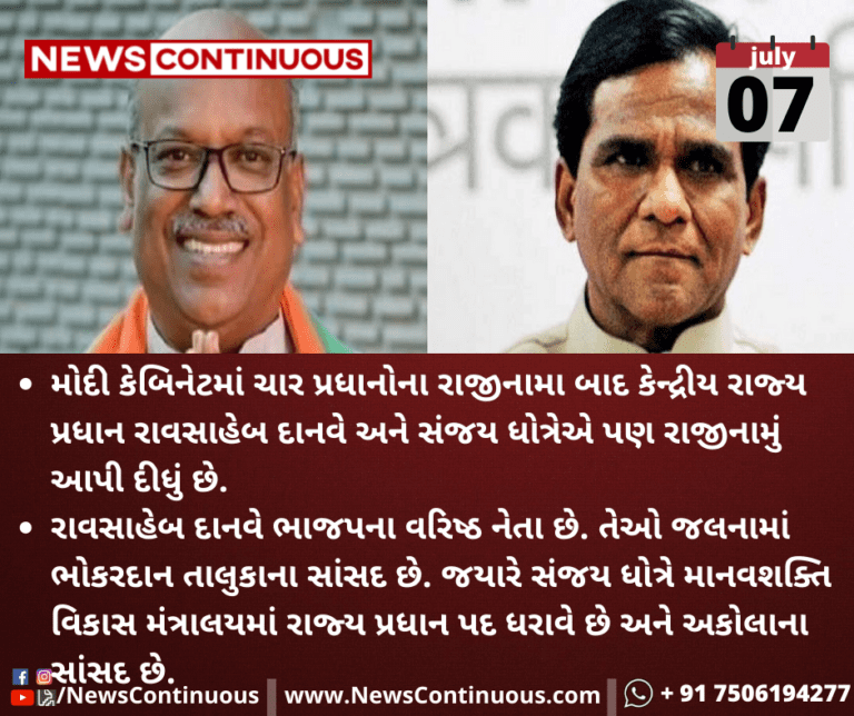 મોદી કેબિનેટમાં ચાર પ્રધાનોના રાજીનામા બાદ કેન્દ્રીય રાજ્ય પ્રધાન રાવસાહેબ દાનવે અને સંજય ધોત્રેએ પણ રાજીનામું આપી દીધું છે.
