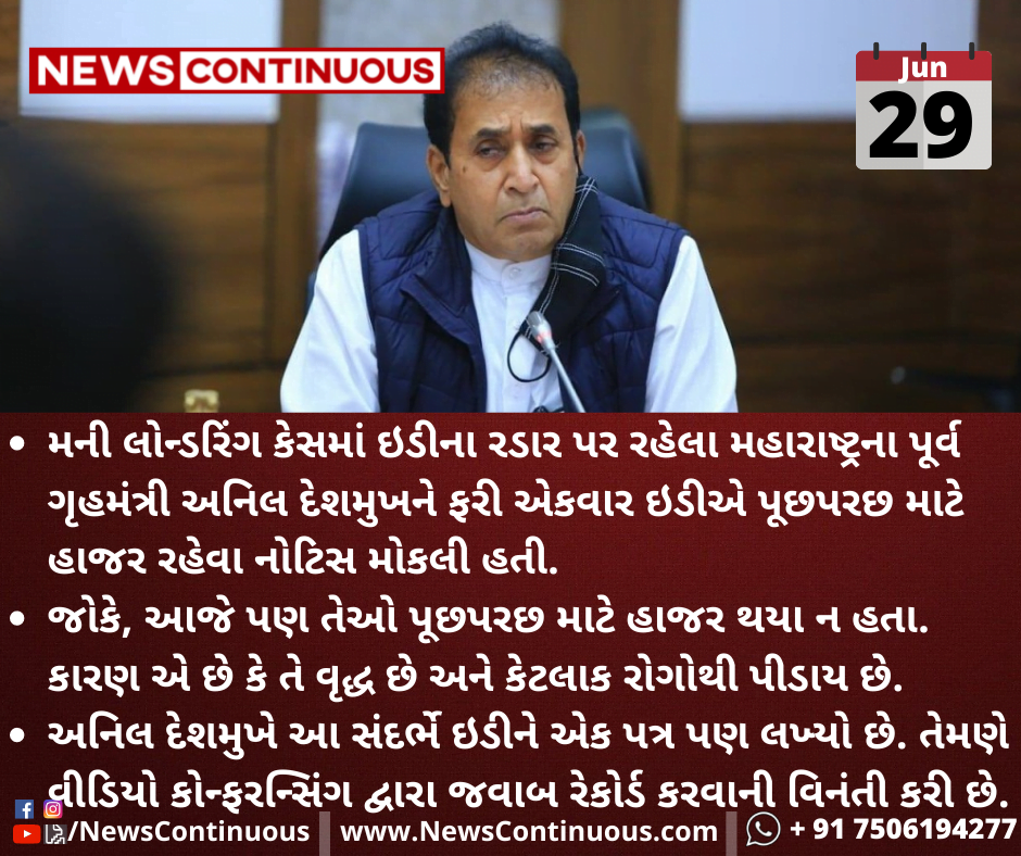 મની લોન્ડરિંગ કેસમાં ઇડીના રડાર પર રહેલા મહારાષ્ટ્રના પૂર્વ ગૃહમંત્રી અનિલ દેશમુખને ફરી એકવાર ઇડીએ પૂછપરછ માટે હાજર રહેવા નોટિસ મોકલી હતી.