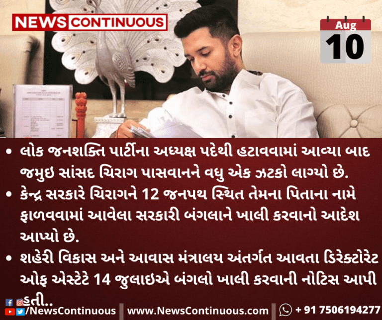 કેન્દ્ર સરકારે ચિરાગને 12 જનપથ સ્થિત તેમના પિતાના નામે ફાળવવામાં આવેલા સરકારી બંગલાને ખાલી કરવાનો આદેશ આપ્યો છે.