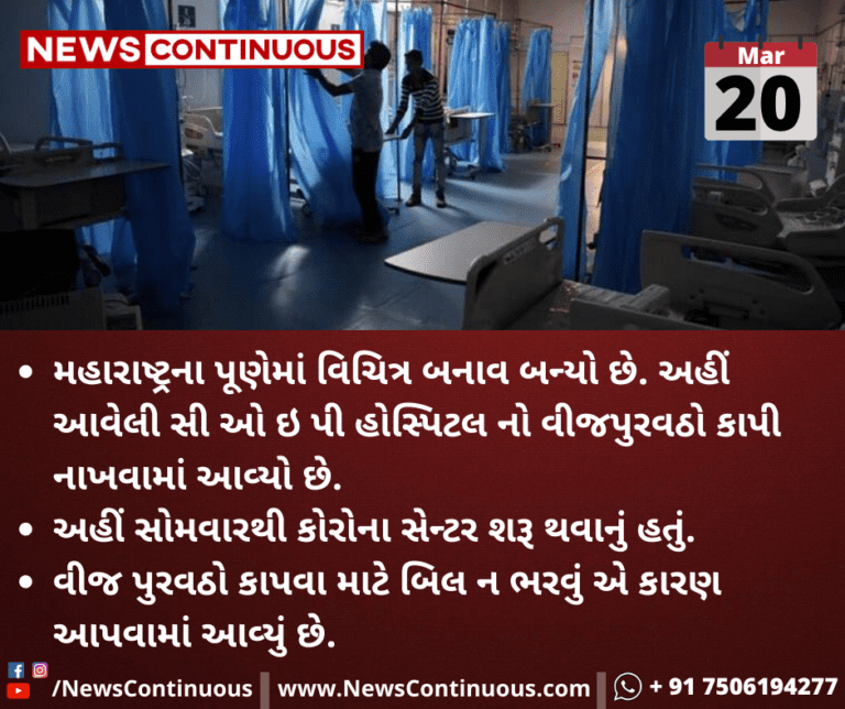મહારાષ્ટ્રના પૂણેમાં વિચિત્ર બનાવ બન્યો છે. અહીં આવેલી સી ઓ ઇ પી હોસ્પિટલ નો વીજપુરવઠો કાપી નાખવામાં આવ્યો છે.