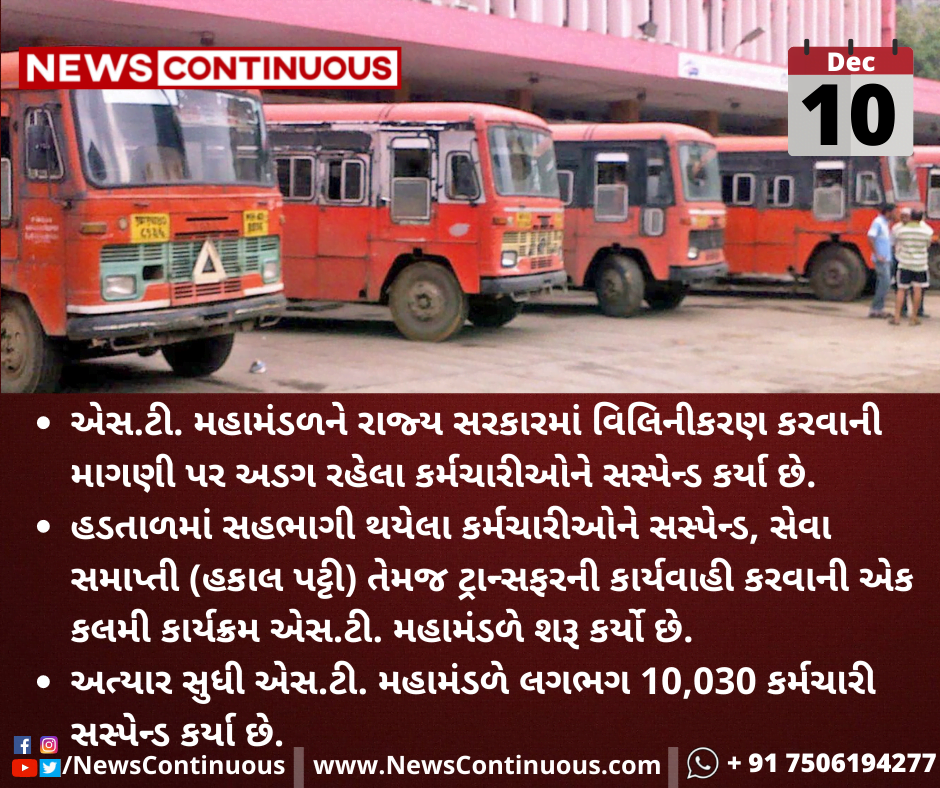 એસ.ટી. મહામંડળને રાજ્ય સરકારમાં વિલિનીકરણ કરવાની માગણી પર અડગ રહેલા કર્મચારીઓને સસ્પેન્ડ કર્યા છે.