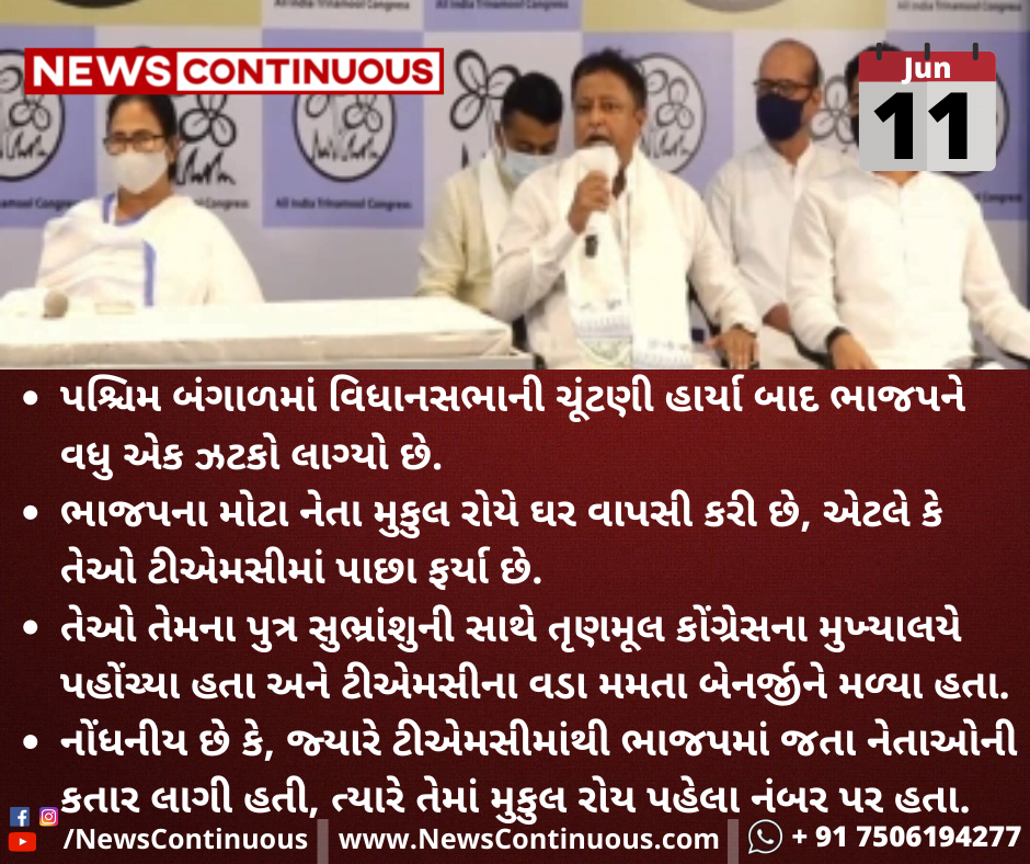 ભાજપના મોટા નેતા મુકુલ રોયે ઘર વાપસી કરી છે એટલે કે તેઓ ટીએમસીમાં પાછા ફર્યા છે.