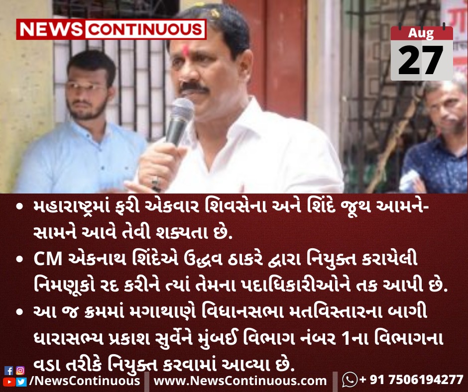આ જ ક્રમમાં મગાથાણે(Magathane) વિધાનસભા મતવિસ્તારના(Assembly Constituency) બાગી ધારાસભ્ય(Rebel MLA) પ્રકાશ સુર્વેને(Prakash surve) મુંબઈ વિભાગ નંબર 1ના વિભાગના વડા તરીકે નિયુક્ત કરવામાં આવ્યા છે.