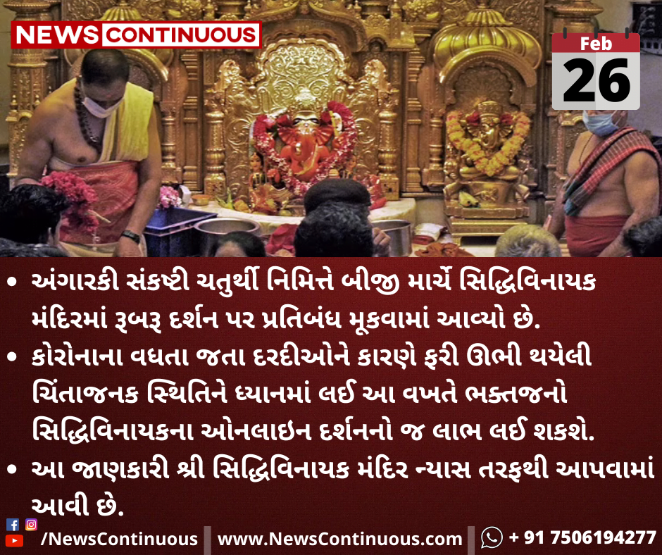 અંગારકી સંકષ્ટી ચતુર્થી નિમિત્તે બીજી માર્ચે સિદ્ધિવિનાયક મંદિરમાં રૂબરૂ દર્શન પર પ્રતિબંધ મૂકવામાં આવ્યો છે. કોરોનાના વધતા જતા દરદીઓને કારણે ફરી ઊભી થયેલી ચિંતાજનક સ્થિતિને ધ્યાનમાં લઈ આ વખતે ભક્તજનો સિદ્ધિવિનાયકના ઓનલાઇન દર્શનનો જ લાભ લઈ શકશે.