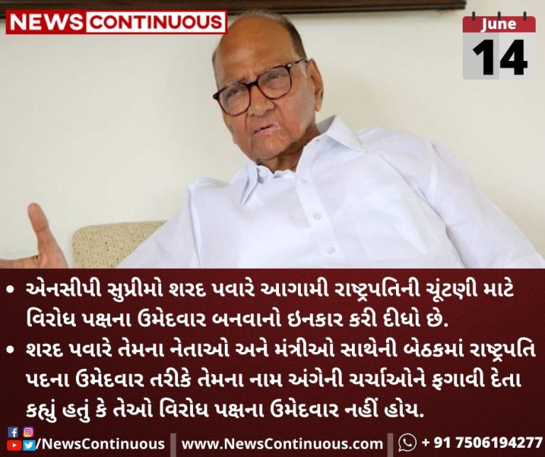 એનસીપીNCP) સુપ્રીમો શરદ પવારે(Sharad Pawar) આગામી રાષ્ટ્રપતિની ચૂંટણી(Presidential election) માટે વિરોધ પક્ષના(Opposition Party) ઉમેદવાર બનવાનો ઇનકાર કરી દીધો છે.