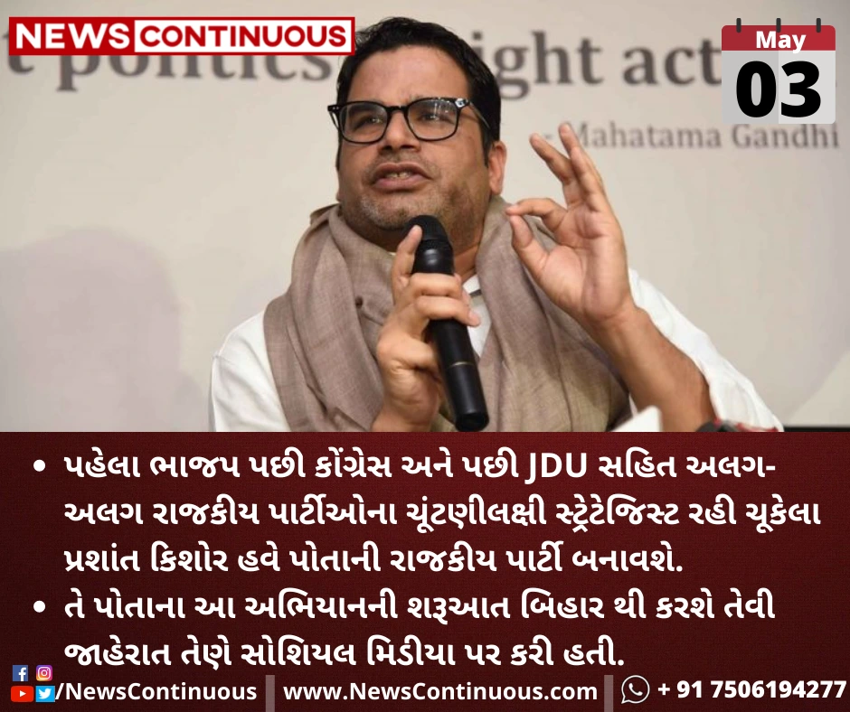 પહેલા ભાજપ(BJP) પછી કોંગ્રેસ(Congress) અને પછી JDU સહિત અલગ-અલગ રાજકીય પાર્ટીઓના(Political parties) ચૂંટણીલક્ષી સ્ટ્રેટેજિસ્ટ(Electoral strategist) રહી ચૂકેલા પ્રશાંત કિશોર(Prashant kishor) હવે પોતાની રાજકીય પાર્ટી બનાવશે.